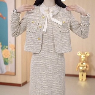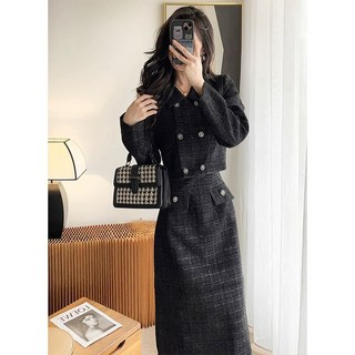 여성 소향풍 세트 캐주얼 봄 가을 긴팔 트위드 자켓 + 하이웨이스트 H라인 롱 스커트 상하의 투피스 기질 소향풍 트위드 투피스 세트 MJS
