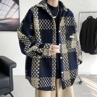 FANSYLI 트위드 코트 남자 봄가을 캐주얼 체크 카라 자켓 남방 점퍼 W9S03