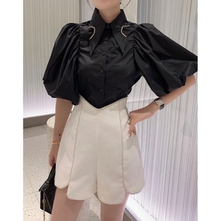 로코코 우아 럭셔리 큐빅 보석 비쥬 카라 호박 퍼프 소매 코튼 면 카라 블라우스 수입명품