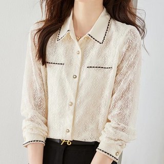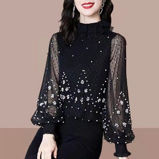 쩐쿠 봄 여성 반폴라 레이스 시스루 퍼프 블라우스 Z54