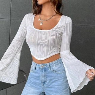 여성 리로저 블랙 벨 슬리브 크롭 니트 탑 긴팔 티셔츠