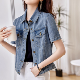 심플 패션 청자켓 카라 반팔 데님코트 얇은 청셔츠 빅사이즈 여름 캐주얼 아우터