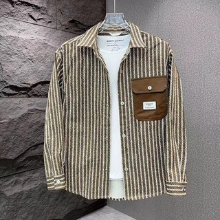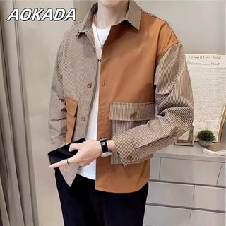 AOKADA 남자셔츠 봄가을 스트라이프 셔츠 남성용 멋진 개성 있는 패치워크 스타일 일반 칼라 상의 겉옷 2색