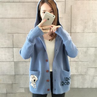 besteffie 여성 카디건 봄 가을 루즈핏 레터링 캐릭터 편한 투포켓 오버핏 니트상의 긴팔상의 캐주얼 데일리 빅사이즈 아우터 후드 니트 가디건 C88