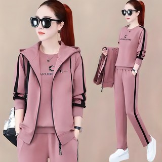 밴딩 일자 팬츠 트레이닝바지 + 후드 집업 + 맨투맨 티셔츠 빅사이즈 여성용 간절기 트레이닝 세트 3종세트 D99U