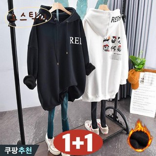 오스틱니[150kg까지 특가상품] 1+1 후드티 여성 가을 겨울 프린트 캐릭터 레터링 오버핏 후드 기모 박스티 롱 제인드 티셔츠 긴팔 가을옷 캐주얼 패션 데일리 빅사이즈상의 맨투맨