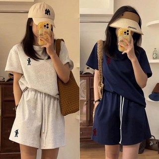 캐주얼 빈티지 트레이닝 세트 여성 여름 루즈핏 라운드 레터링 반팔 맨투맨 티셔츠+와이드핏 밴딩 반바지 심플 베이직 학생 투피스