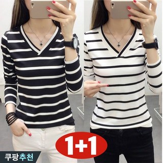 (원단좋은) 1+1 빅사이즈 여성 스트라이프 브이넥 긴팔 티셔츠 봄 가을 사계절 날씬해보이는 배색 줄무늬 슬림핏 이너 기본티 큰옷 여성의류 3xl 캐주얼 데일리 여자 패션 티 세트