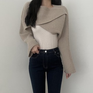 VANANA2 여성 캐주얼 꾸안꾸 유니크 언발 크롭 볼레로 숄더 니트