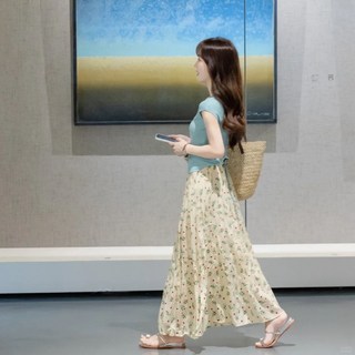 웨일쓰 여성 플라워무늬 허리밴딩 주름 A라인 캐주얼 롱스커트