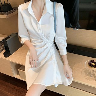 [레티고] 여성 실키 새틴 셔링 주름 셔츠 원피스