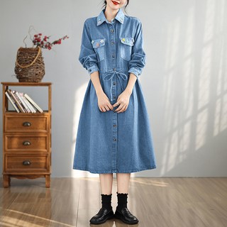 BLACK K7 여성 봄 꽃무늬 허리 조임 빅사이즈 데님 셔츠 롱원피스