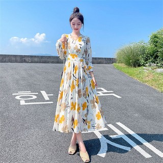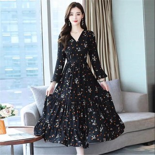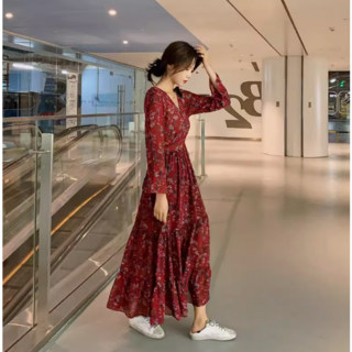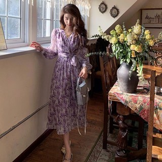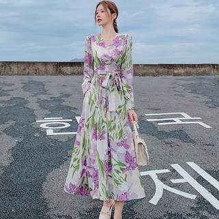 besteffie 봄 여름 가을 플라워 프린트 원피스 롱 드레스 브이넥 긴소매 롱 원피스 여성스러운 스타일 K18