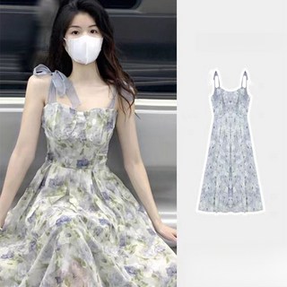 이 드레스는 주로 여성들의 여름 스타일로 선택되며, 플라워 패턴이 드레스 전체에 아름답게 인쇄되어 있습니다.