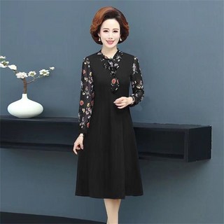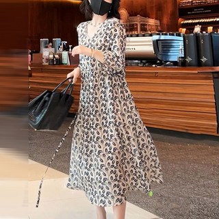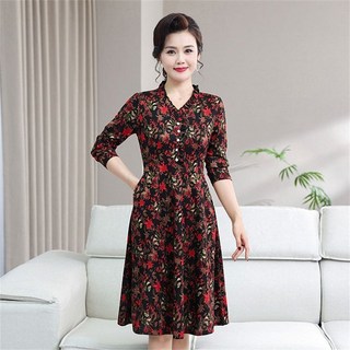 besteffie 중년여성 플라워 패턴 프린트 소매 우아한 스타일 봄 가을 미디원피스 빈티지 브이넥 드레스 K18