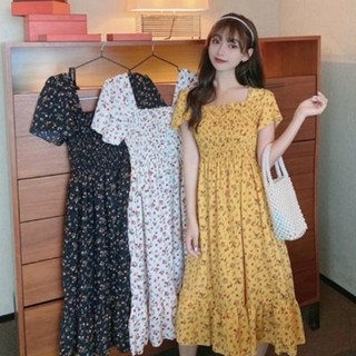 여름 휴양지 원피스 여성 바캉스 드레스 플라워 프린트 미디 스퀘어 칼라 퍼프 슬리브 프랑스 빈티지 패션