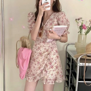 cammello 퍼프소매 반팔 쉬폰 미니 원피스 여름 프릴 랩원피스