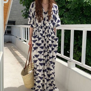 [당일출고] 브이넥 슬림핏 나염 랩원피스 여름 스판 롱원피스