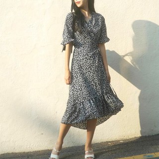 라핏 플레어 랩스타일 반팔 원피스 (블루 블랙)