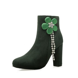 스웨이드 라운드코 플라워 진주 큐빅 장식 발목 반부츠 블록 힐 구두 가을겨울 9cm
