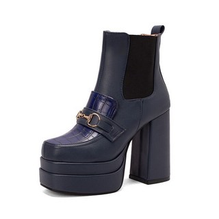 찡 스퀘어 버클 벨트 스트랩 장식 레더 블록 힐 하이힐 발목 반부츠 여자구두 12cm