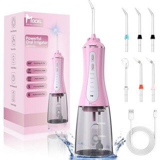 5가지 모드의 워터 덴탈 치실 구강 세정기 350ml 무선 치아 세정기 픽 6 팁 여행 및 가정용 보조기 브리지 케어를 위한 IPX7 방수 충전식 강력한 휴대용 배터리, 핑크, 1개