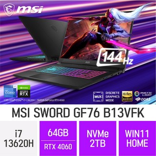 [당일출고] MSI Sword GF76 B13VFK - 게이밍 노트북, WIN11 Home, 64GB, 2TB, B