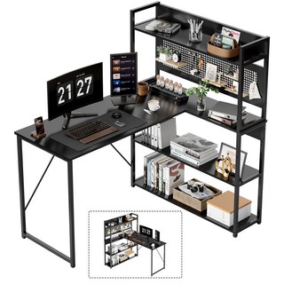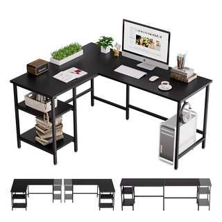Homall L자 컴퓨터 책상 학생 사무용 수납형 책상 데스크 스틸 프레임 USB+LED라이트 선반 4단, 블랙